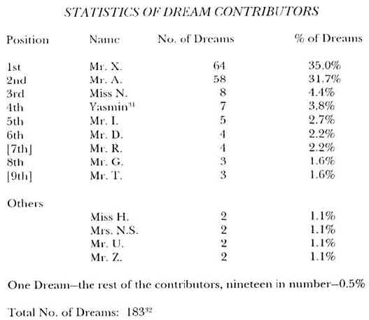 Dream No. 184 was a late addition and has not been included in the above statistics.